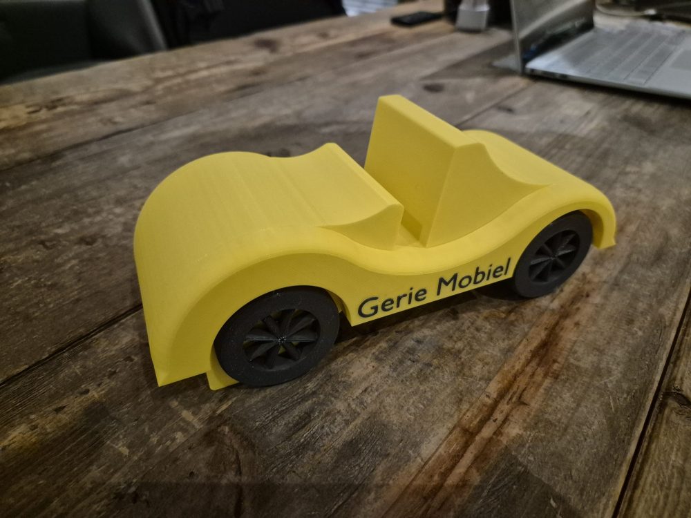 Soms begint een ontwerp met een simpel verzoek. In dit geval kregen we de vraag om een klein cadeautje te bedenken voor een collega die een nieuwe uitdaging had gevonden. Tijdens de intake kwamen twee thema’s naar voren: een gele auto en een mobiel. Dat was voor ons het startpunt van een creatief proces.