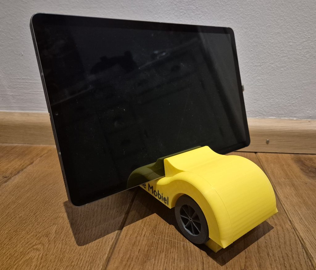 We wilden iets maken dat niet alleen leuk was om te geven, maar ook praktisch bruikbaar. Al snel ontstond het concept van een mobielhouder in de vorm van een gele auto. Een object dat op het bureau kan staan en de telefoon stevig op zijn plek houdt.